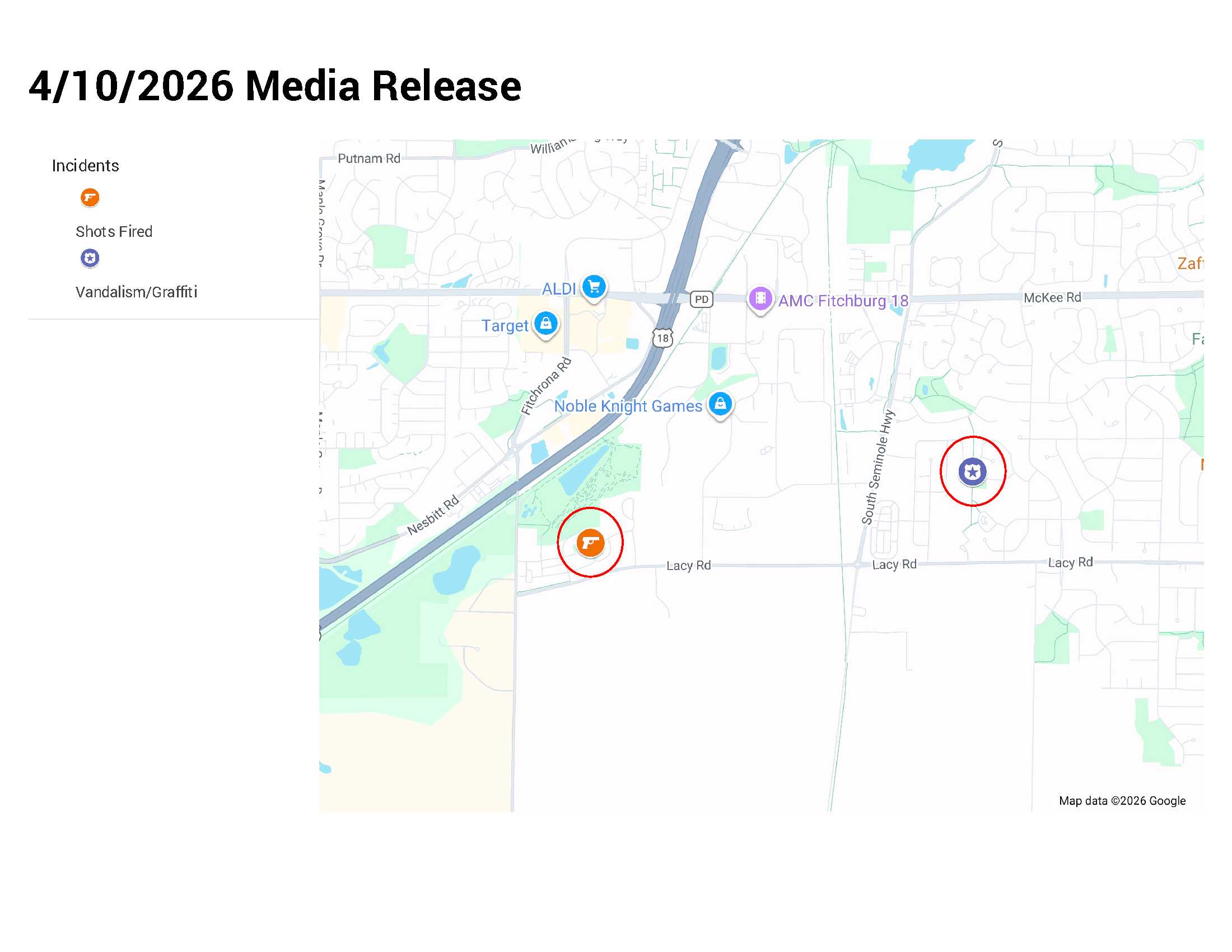 The investigations for each are ongoing and anyone with information or video is encouraged to contact the Fitchburg Police Department at (608) 270-4300, or the Non-Emergency Dispatch (608) 255-2345. Anonymous tips can be made to Madison Area Crime Stoppers by calling (608) 266-6014 or via P3Tips.com. Tipsters may be eligible for a cash reward.